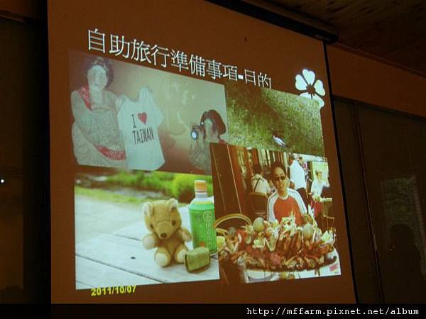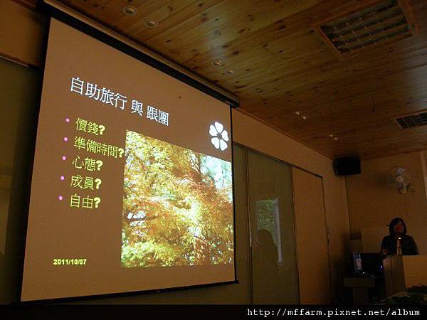 下一堂課,由教研組研究助理詹芳瑜小姐與大家分享她的自助旅行經驗談。