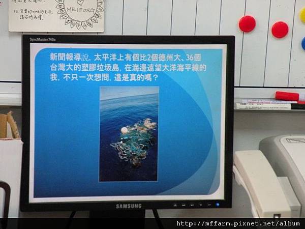 解說員俐璇與同事們分享聽完太平洋垃圾渦流的演講簡報。