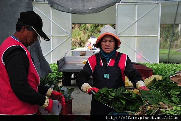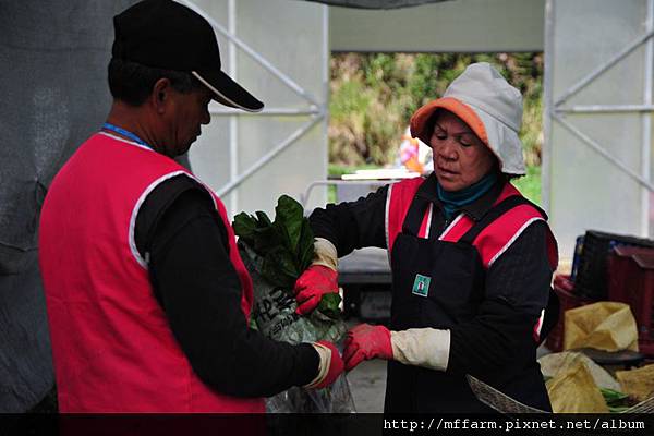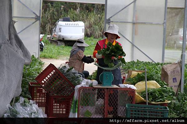 菠菜館裡忙著秤重、包菜的現場工作同仁。