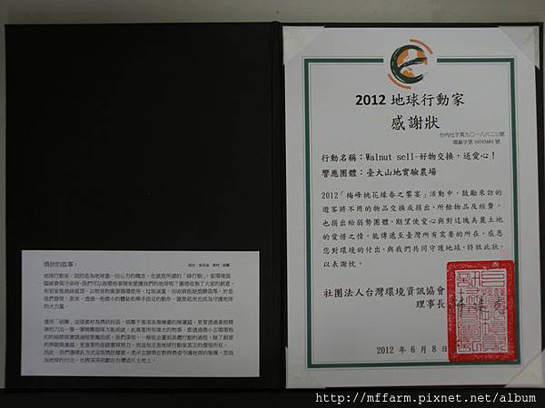臺大山地實驗農場入圍「地球行動家」企業團體組感謝狀