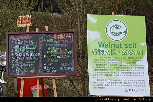 當然,在改變之前,一定是有許多小小的想法、思考、事件,在累積、發酵、醞釀,有一天忽然就爆炸般的開起花來!當有一天理解到,你的不需要,可能是他人的必要,既然自己用不到,何不讓那件耗用地球珍貴資源才能產生的物品產生另一種全新的生命循環呢?更何況,還能讓家裡變得寬敞一點呢!而在農場內,經營組的李美玲組長則跟我分享了「免費的最貴」與「用不到的東西最貴」的想法。於是,在2012年臺大山地實驗農場每年三月盛大舉辦,可免預約以購票方式入場參觀的「春之饗宴」活動中,我們規畫了「Walnut sell好物交換,送愛心!」的站別。
