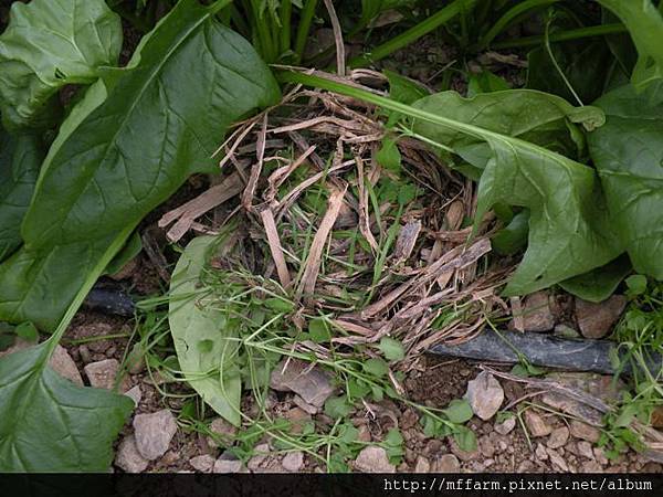健康無毒的菠菜田裡,發現了巢鼠用草葉編織而成的巢,不過也許受到驚擾,巢鼠都已離開了。