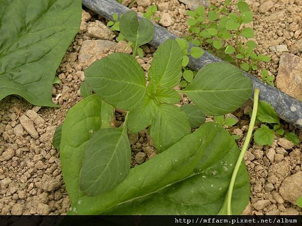 菠菜叢中夾雜的野菜之一「野莧」,風味很特殊哦!
