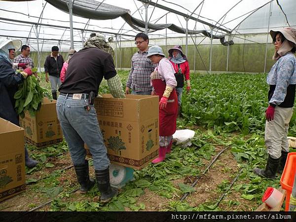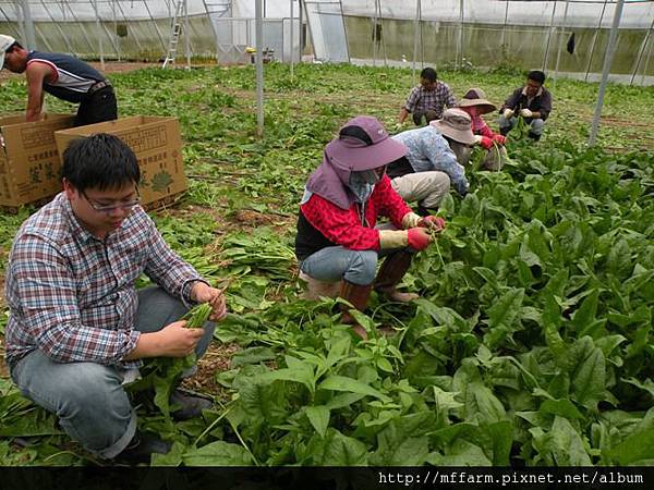 同仁們採收菠菜中。