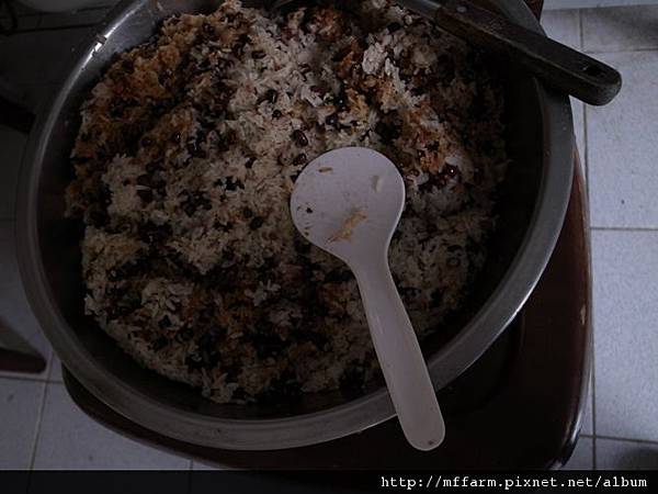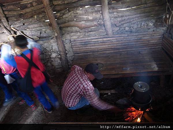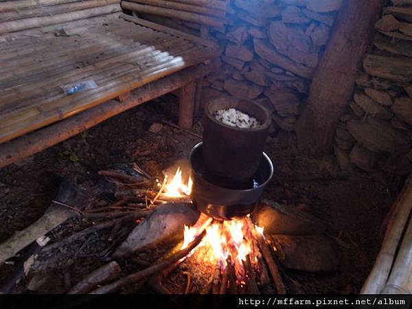 同事烏毛幫煮紅豆飯的三角灶添加柴火。