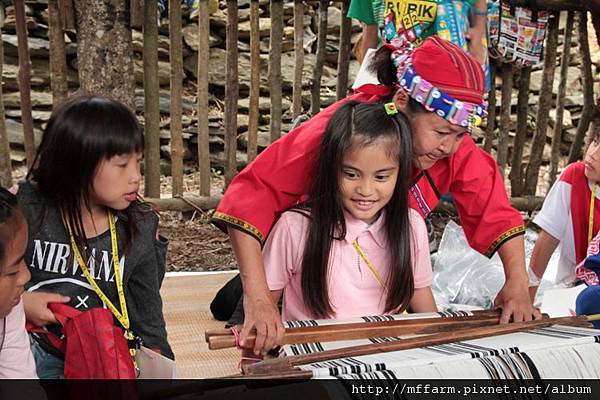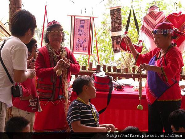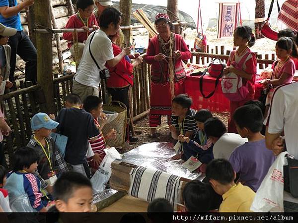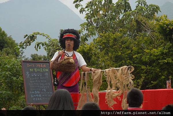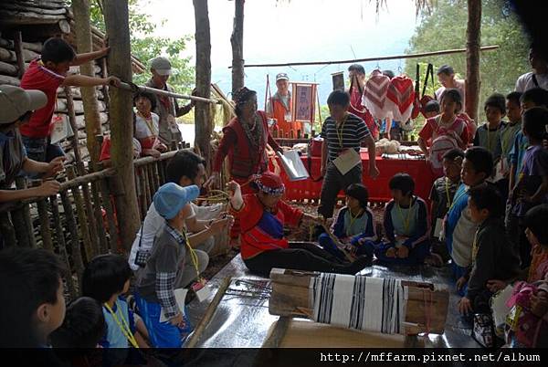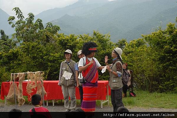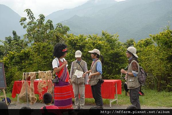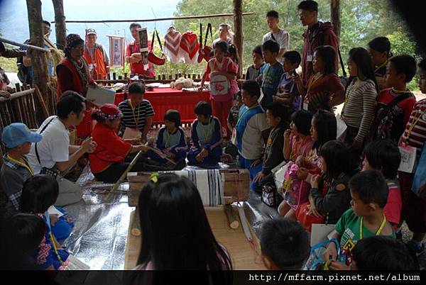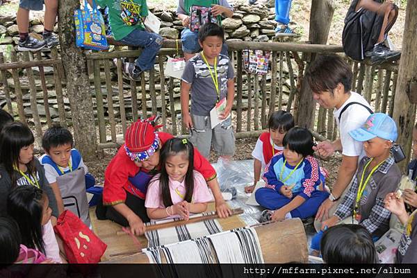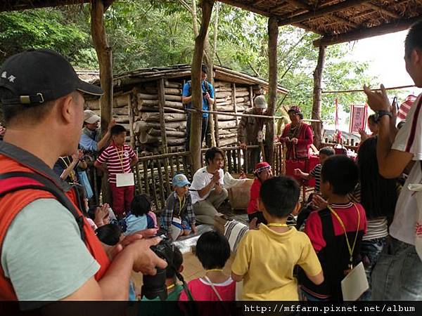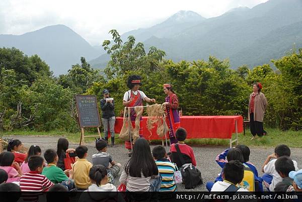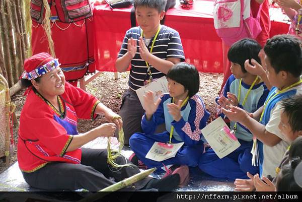 此次中餐以合菜方式處理,搭配賽德亞族常見食材,以及事先精心烹製的紅豆飯,孩子們都吃得津津有味。用完餐,同樣在餐廳旁的空闊草地盡情的玩耍了一會後,便由阿嬤集合大家,準備進行下午精采刺激的大地遊戲闖關活動。此階段分別進行了利用上午聽過的三個原住民神話故事圖卡重新拼湊出新的故事,並表演給大家看的「故事拼圖」、以動作而不能說話的方式,表演抽出的各式與傳統賽德克亞族文化有關題目的「比手畫腳」以及強化對民俗植物認知且培養團隊合作默契的「拋繡球」活動。結束後,各組在原地進行薏苡串珠手鍊的手工DIY活動,然後才再度集合,讓小朋友們簡單分享今天的心得,旋即進行頒獎、領取室內淨化空氣植物以及大合照的活動。