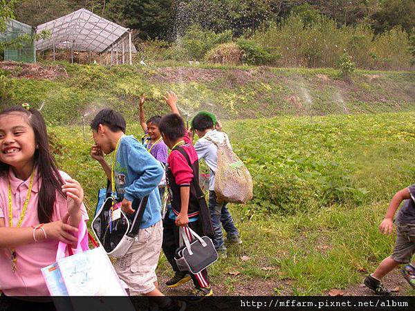 孩子們開心的與田裡正在噴灑的水柱玩耍。