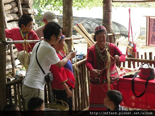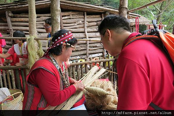 拉拜阿嬤與露比阿嬤帶大家認識摘取苧麻的過程。