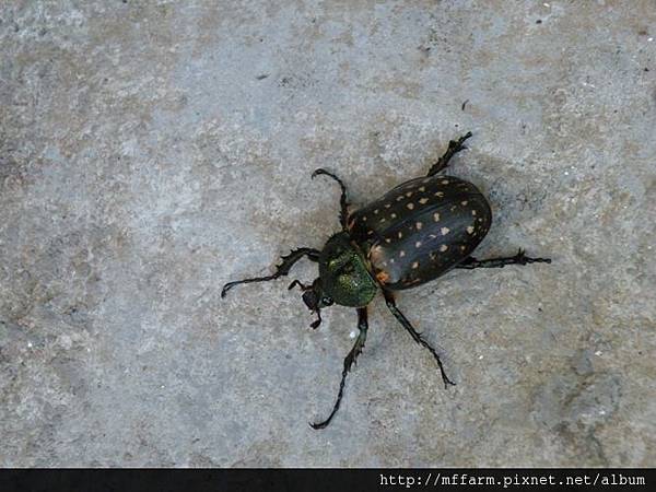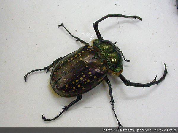 身為台灣最大型金龜子的長臂金龜,體長有4至近7公分,為保育類的昆蟲,平時生活於中、低海拔山區,於夏天出沒。雄長臂金龜的手臂很長,除了可以拿來打架佔地盤外,還可以用來擁抱美嬌娘!而牠那有著黃褐色碎斑的翅鞘,綠黑色的前胸背板,毛茸茸的腹部,以及龐大的身軀……,讓人想不記住牠都很難吧!
