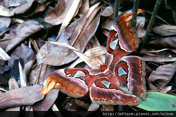 天蠶蛾科這類蛾類,是蛾類中體型碩大的族類,而其中的皇蛾,除了是台灣最大型的蛾類外,也是全世界體型最大的蛾類呢!其展翅時約有20至25公分寬,因為其上翅翅端有類似蛇頭的造型且外突,也有人稱其為「蛇頭蛾」,夜晚會趨光而來,在5至9月在平地或低海拔山區都有機會見到牠的芳蹤哦!