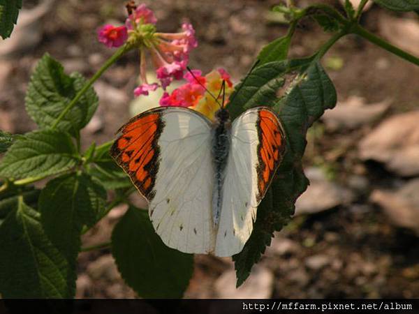 翅膀的兩端有著漂亮的橘紅色色斑,又名「橙端粉蝶」,整體看起來粉粉的,有一種浪漫的感覺浮泛在牠的翅面上,牠的展翅寬約有7至9公分,因此算是粉蝶家族中個子最大的一種。飛行快速的牠,再加上像是撒了痱子粉在身上,若是不小心撞上了蜘蛛網,也許可以較順利的掙脫,反而讓蜘蛛絲沾上了鱗粉,而變得比較不黏了呢!