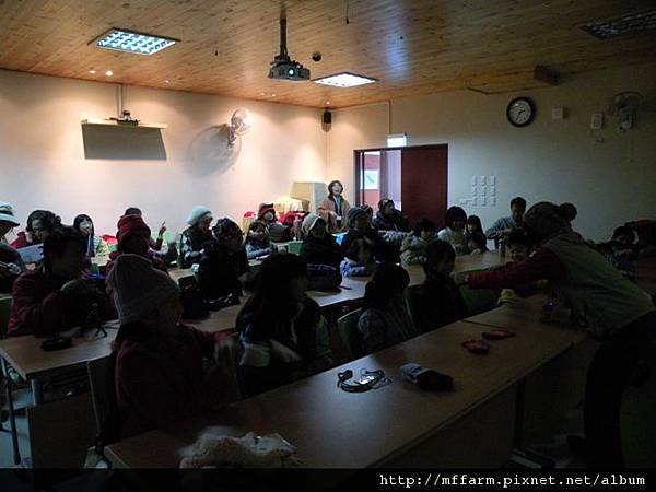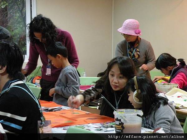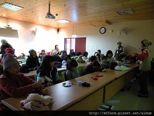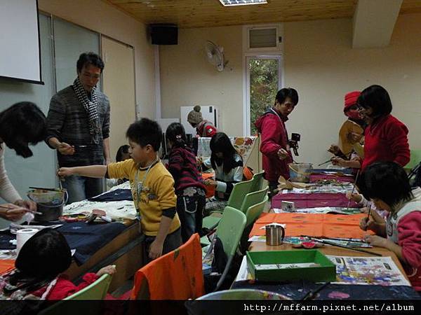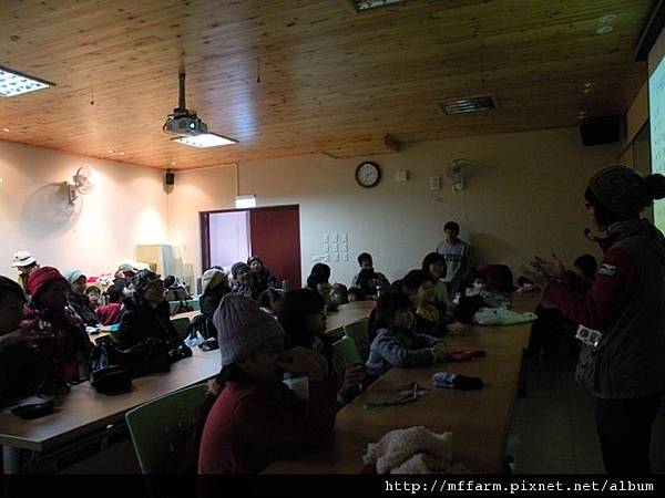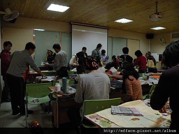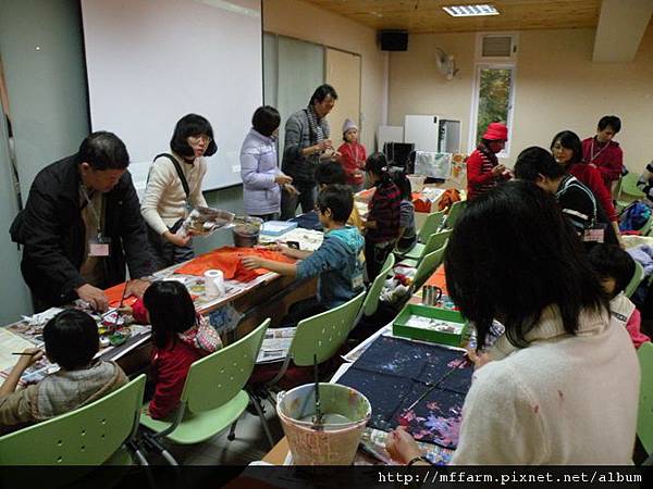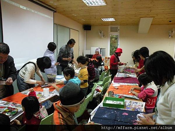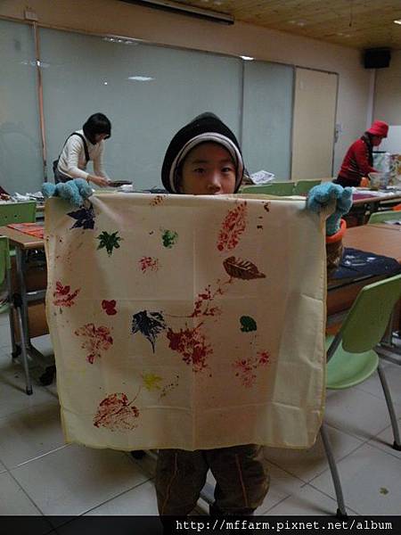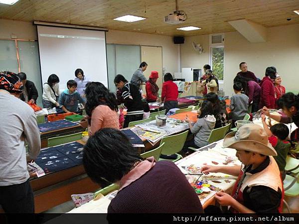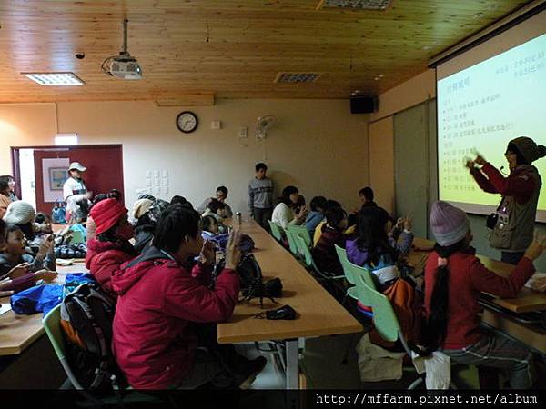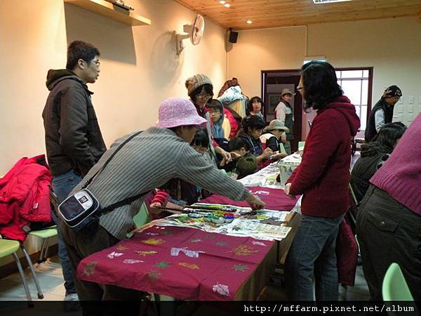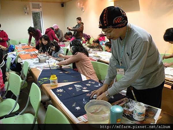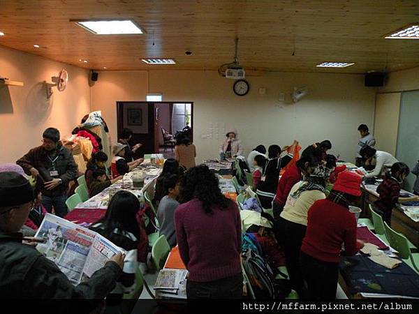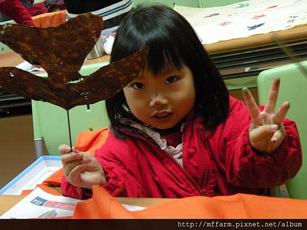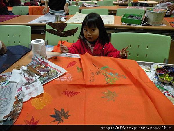 在101.12.09-10這兩天,有40多位自學家庭的爸爸媽媽和小朋友們,來到臺大山地實驗農場進行兩天一夜的體驗之旅,首先,先讓大家一起在會議室裡集合說明行程,並由解說員愛玉帶領大小朋友玩手指頭遊戲,暖暖手指頭後,在第一天下午就先進行了「彩繪大自然」的活動。雖然因為下雨而無法先行撿拾葉子,但解說員們為了預防這樣的狀況,事先已有準備好的葉子供大家適量取用。