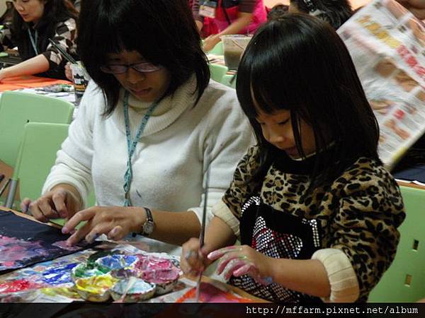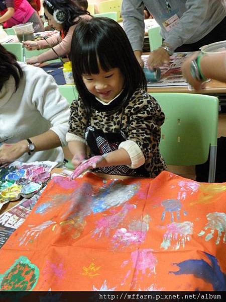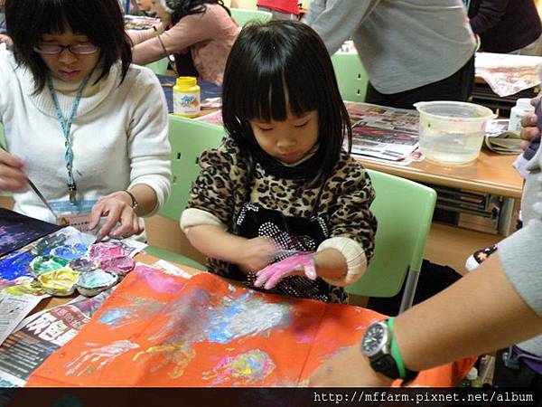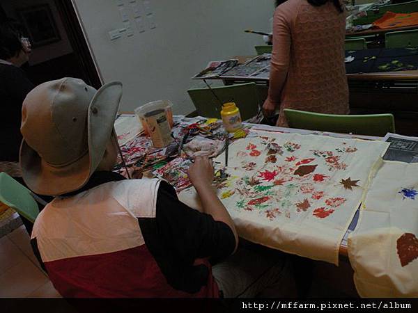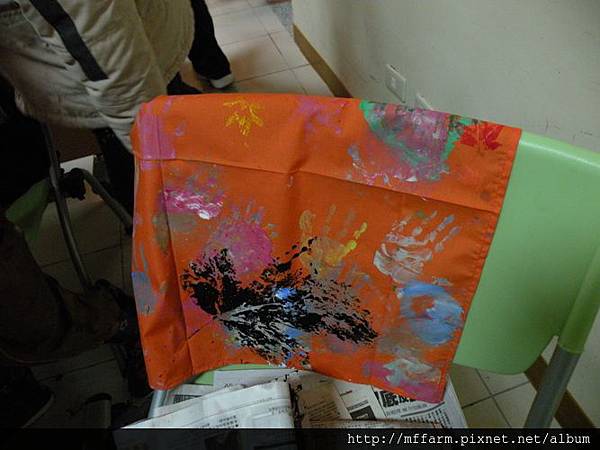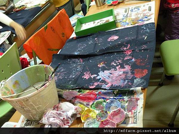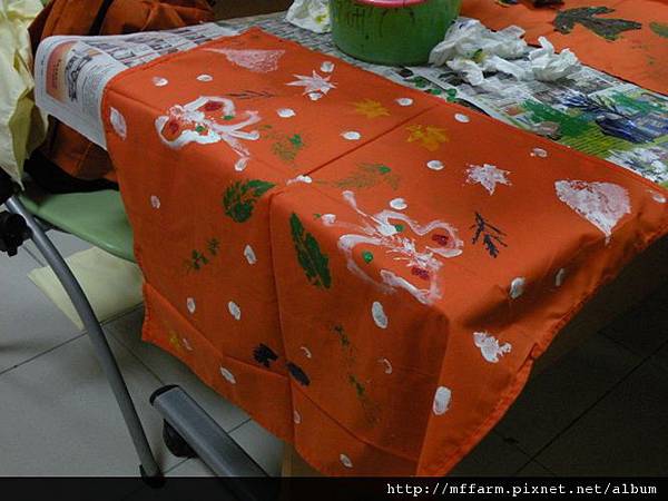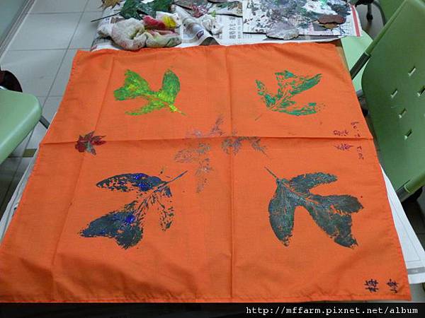 領用頭巾後,大小朋友便都很有秩序的自行拿取報紙鋪在桌面上,分工合作去提水,再挖取適量顏料,便開始利用畫筆及葉子,在屬於自己的頭巾上頭開始變魔術及玩耍嘍!