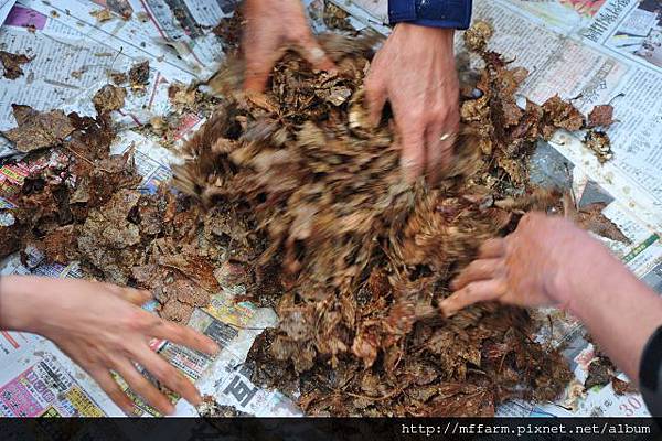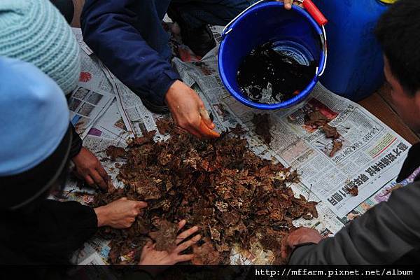 用一把約100 公克已培養好的乾竹葉2.(上已長滿白色菌絲), 1公斤米糠, 糖蜜1公斤, 放入20公升水中拌勻, 加蓋放置7日即成.