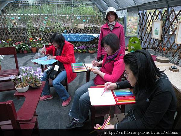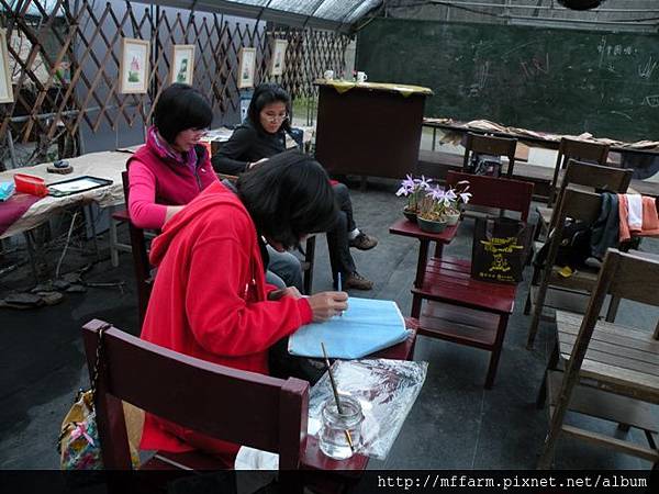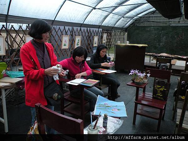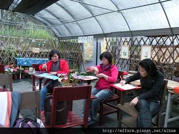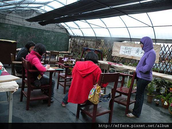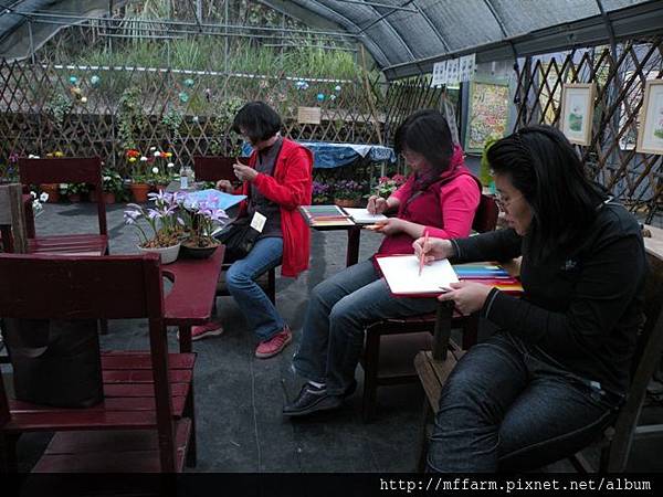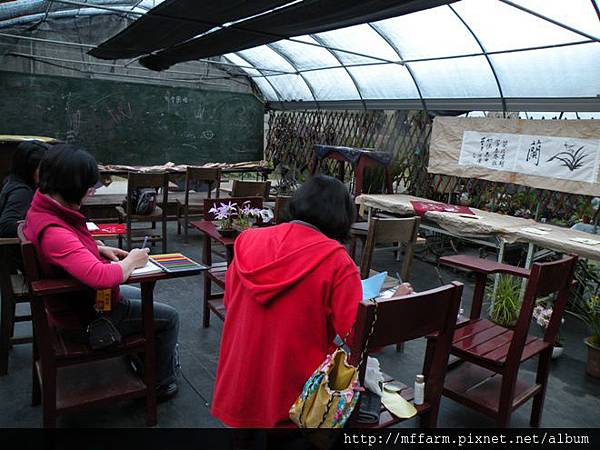 轉入蘭花展示室安靜的小教室裡,有三位志工老師正對著一葉蘭在進行創作。