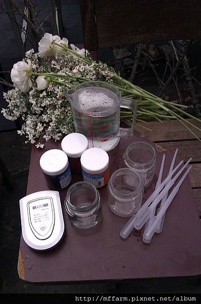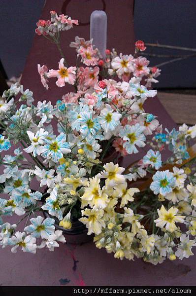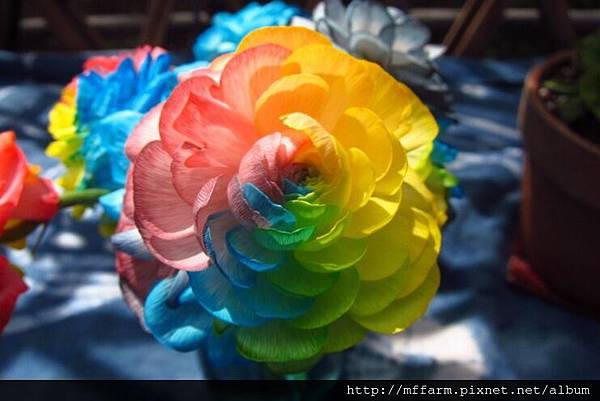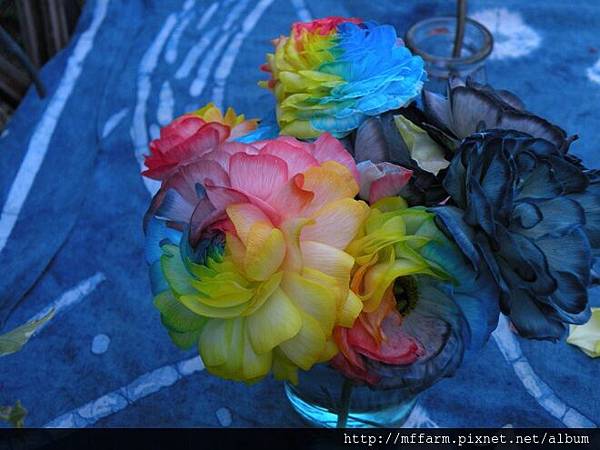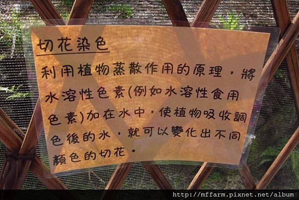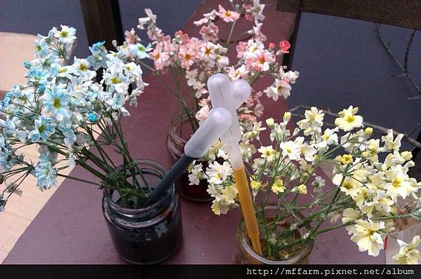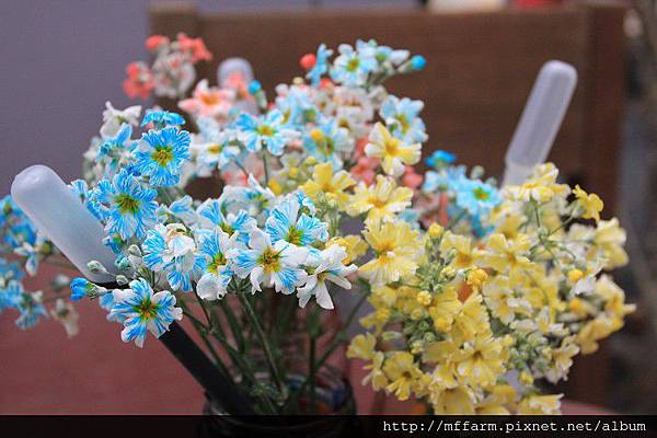 之前有與大家分享過臺大山地實驗農場工作同仁學習切花染色與蠟花製作DIY的過程(http://mffarm.pixnet.net/blog/post/95584300)。在春之饗宴活動開始前,農場同仁芳瑜小姐再度利用手邊既有的花卉製作切花染色與蠟花。她特地選擇了白色的花朵,染出了漂亮的顏色。就讓我們一起來欣賞她製作的過程吧!