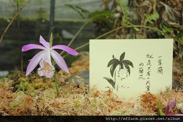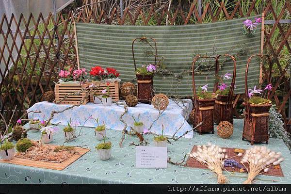 蘭花展示室的另一個區域,由臺大山地實驗農場的工作同仁發揮巧思,運用花藝布置造景的技術,以一葉蘭為主題,結合盆栽、苔蘚、小飾品的搭配。襯托出一葉蘭不同的風貌,也與大家分享屬於一葉蘭的各式可能。