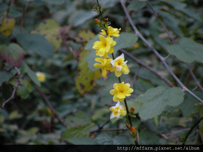 提早開花的迎春花,若遇上寒流,一不小心花瓣就被凍成白色的了。(攝於梅峰)