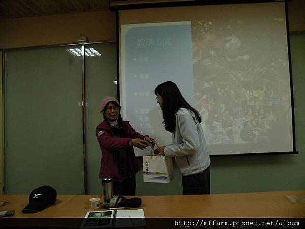 非常感謝劉老師所帶來精彩的演講,並由教研組郭紀凡技士代為致贈農場環境教育出版品,以答謝劉老師的分享。