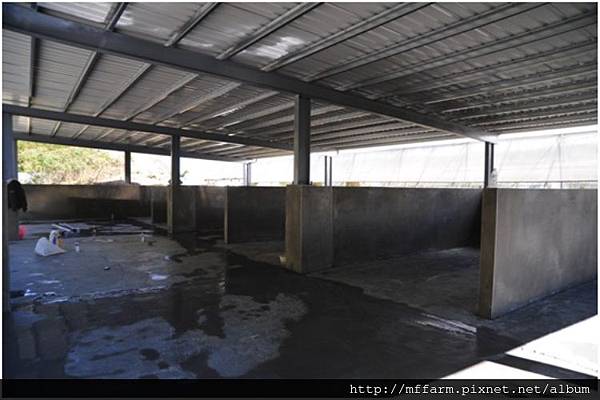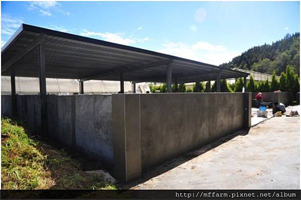 劉力學老師早年曾來場演講,而後農場也派出許多相關業務人員到臨海農場參觀,算是對於農場的堆肥場建置較有啟發作用,而後農場堆肥也朝廚餘堆肥化的方向製作。農場堆肥場的配置是綜合多家農場參考而得,主要考量的因素是,一:要有遮雨棚,能完全避雨。二是:水泥地面,能以山貓翻堆作業、調整水分,收集汙水。三是:有圍牆與周圍環境隔離。下圖為農場堆肥場內外觀: