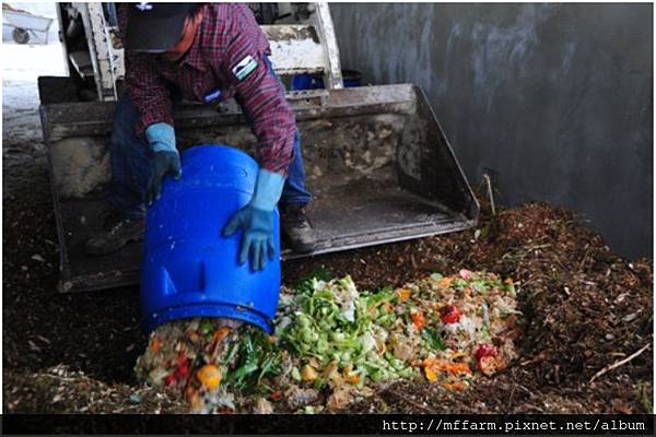 下圖是堆肥的製作,圖中可看出堆肥的成分:廚餘與碎木屑。再下圖為碎木屑的製作。