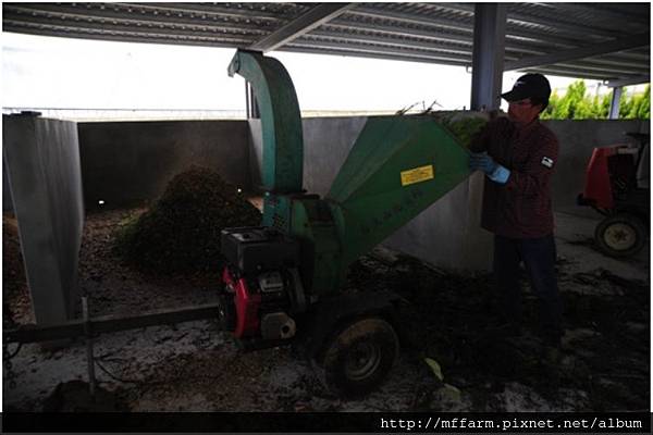 問題是ㄆㄨㄣ的水分很多,需有其他的資材調整水分,而資材中考慮到碳氮比的因素,最適宜的莫過於木屑。農場多的是枯枝落葉,又有碎木機,而且林下的枯枝落葉層層疊疊好幾年,翻開其中有些還有白白的微生物菌絲是再好不過。因此農場堆肥材料的成分氮原主要是中央廚房的廚餘,而氮原主要的來源是碎木屑,當然還有農場生產的廢棄物。這些材料多是現有的,原是應該清運、掩埋處理的,現在以堆肥化處理能省下不少能源,只是要將枯枝碎化成木屑得動用碎木機,這倒是耗去不少能源,可能的理想方式是購買菇屑取代部份的碎木屑,而枯枝落葉則是堆置幾年腐化後再利用。