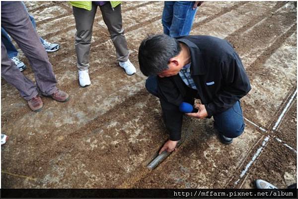 上圖是陳明泉副場長在為農場員工解說曝氣式堆肥場氣管的鋪設方式。