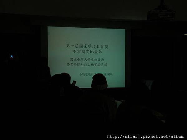 歷時近一年,臺大山地實驗農場在去年獲得國家環境教育獎南投縣機關類特優,並在102年2月22進行了全國性的複審http://mffarm.pixnet.net/blog/post/96356795,緊接著因入圍全國前五名,而在5月3日進行決審。