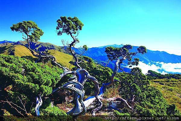 玉山圓柏因高山地形、氣候影響,常呈現扭曲伸展的樹形,有種蒼勁之美。