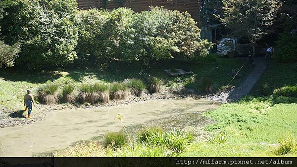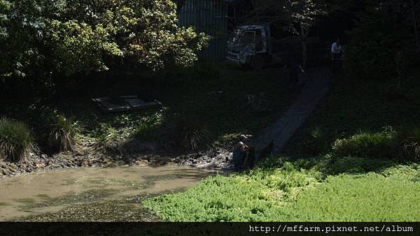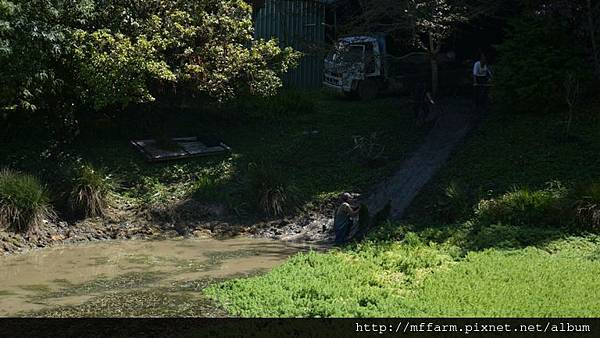 黑水塘裡的強勢外來挺水水生植物「粉綠狐尾藻」的清理工作。